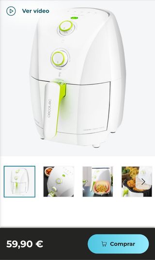 Cecofry Compact Rapid White Freidora sin Aceite 1,5L de Aire Caliente. 900 W, Dietética, Capacidad para 400 gr, Temperatura 200ºC, Tiempo Ajustable, color negro. Posee función horno gracias al cestillo que incluye como accesorio. Programable en tiempo y temperatura. Cocina hasta 400 gramos de patatas de una sola vez. Dispone de termostato hasta alcanzar los 200º. Tiempo ajustable 0-30 min. Recipiente de 1,5 litros de capacidad. Dispone de recetario de cocina. Nueva vale 60€