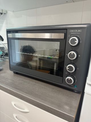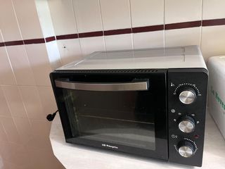 Horno eléctrico de la marca Orbegozo, ideal para espacios pequeños. Es un horno compacto y ligero. Ha sido usado durante bastante tiempo pero está en perfecto estado (salvo por las manchas evidentes de las imágenes) y funciona perfectamente. Viene con dos bandejas, una de rejilla y otra negra completa. También viene con una herramienta que permite sacar las bandejas sin riesgo de quemadura. - Marca: Orbegozo - Tipo: Horno eléctrico - Color: Gris y negro