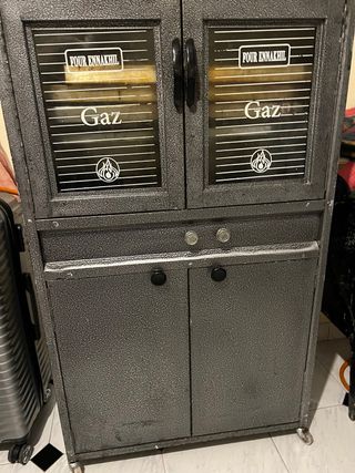 Horno de gas Four Ennakhil con diseño clásico. - Puertas acristaladas con detalles. - Dos niveles de cocción visibles. - Tiradores negros. - Base con ruedas para fácil movilidad.