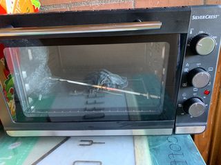 Mini horno electrico de segunda mano - De mesa portable, - Base de acero - Pintura horneada - Interior de acero inoxidable - Dos (2) parrillas regulable - Puerta hermética de cristal resistente a alta temperatura - Encendido mecánico En buen estado y operativo marca "SILVERCREST" SGB C1 (4) 1300W de potencia tal como se muestraen la foto
