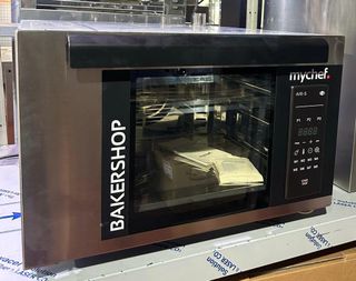 Horno de convección con humidificador. Capacidad 3 bandejas 46 x 33 cm, monofasico 3,6 kW de potencia. Modelo MYCHEF Bakershop Air 3 , completamente nuevo a estrenar precio de liquidacion de exposicion. 40 Programas de cocción. Recomendado para 72 croissants por hora. Vapor regulable. Precio mas iva, envio incluido. Madrid Coslada.Puede utilizarse para locales sin salida de humos al no superar los 10 kW de potencia (7,5 kW en Cataluña) añadiéndole un condensador de vapor. Disponible como accesorio.