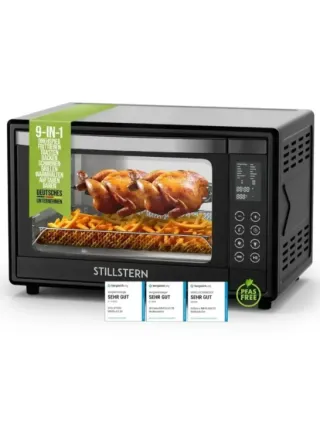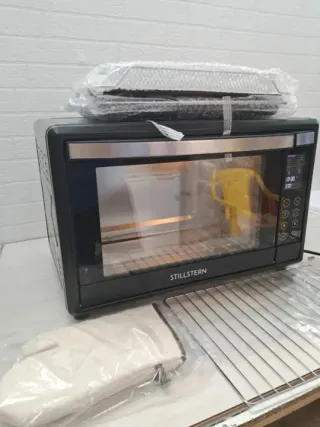 Horno eléctrico Stillstern con una capacidad de 45 litros y 2000W de potencia. Ideal para preparar una gran variedad de platos. Minihorno Stillstern con convección (45 L), versión alemana, 13 programas . accesorios: 2 bandejas, asador, guantes de horno, pantalla LED, 2000 W