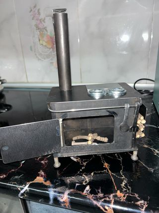 Mini horno portátil de metal, ideal para camping o exteriores. Su diseño compacto lo hace fácil de transportar. - Construcción robusta en metal. - Puerta frontal con bisagras. - Chimenea para ventilación.
