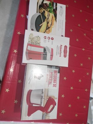 Vendo estupendo pack de electrodomésticos para la cocina. Incluye una palomitera roja, una batidora de pedestal y una crepera eléctrica. Todos los aparatos son nuevos y están en sus cajas originales. SIN ESTRENAR - Palomitera de 1200W. - Batidora de pedestal. - Crepera eléctrica de 700W. Hogar, casa máquina crepes, crep, palomera, eventos, batidora, reposteria PRECIO 45€ por todo GRAN OPORTUNIDAD