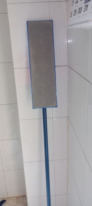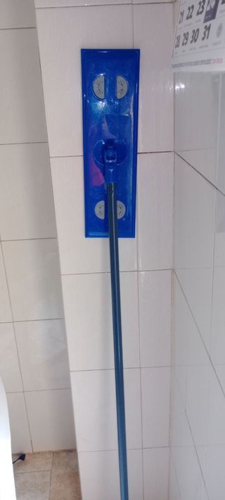 Mopa de limpieza con mango. Está en buen estado. - Incluye dos cabezales de recambio. - Mango de color azul. - Cabezales de microfibra.