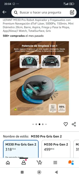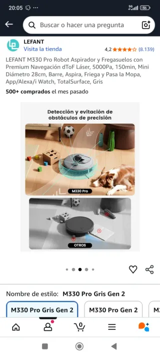 Robot aspirador y fregasuelos LEFANT M330 Pro en color gris. Diseñado para una limpieza eficiente del hogar. - Navegación láser dToF. - Potencia de succión de 5000Pa. - Autonomía de 150 minutos. - Diámetro de 28cm. - Funciones: barre, aspira, friega y pasa la mopa. - Compatible con App, Alexa y iWatch. - Tecnología TotalSurface.