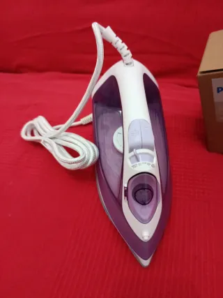 Plancha de vapor Philips 3000 Series en color blanco y morado. - Depósito de agua transparente. - Base de planchado. - Cable de alimentación.