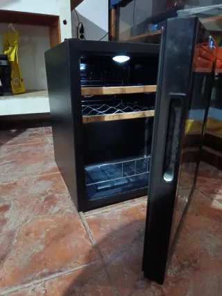 Enfriador de vinos con diseño moderno y elegante. - Puerta de cristal. - Estantes interiores. - Panel de control digital.
