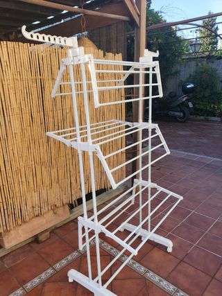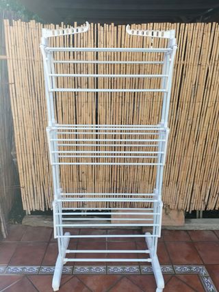 Tendedero plegable de color blanco, ideal para secar la ropa. - Estructura de plástico resistente. - Múltiples niveles para colgar. - Diseño compacto y fácil de guardar.