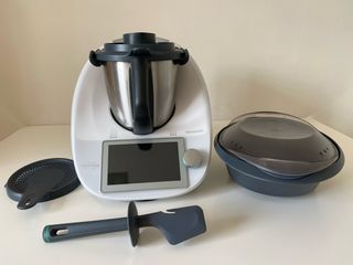 Robot de cocina Thermomix TM6 en color blanco. - Vaso de acero inoxidable. - Pantalla táctil. - Incluye espátula, cestillo, tapa anti salpicaduras, varoma y tapa. Thermomix TM6 en perfecto estado Vendo Thermomix TM6. Funciona sin fallos y se entrega con todo el equipamiento original: vaso de 2,2 L, mariposa, cestillo, tapa anti salpicaduras, cubilete y varoma. Y de extra lleva la bolsa de transporte. Pantalla táctil con recetas guiadas y balanza integrada. Ideal para preparar platos, triturar, amasar y cocinar al vapor. Siempre cuidada y limpiada después de cada uso. 750€ sin bolsa de transporte y 780€ con bolsa de transporte