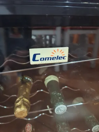Botellero eléctrico de la marca Comelec con capacidad para varias botellas. - Diseño moderno en color negro. - Puerta de cristal. - Estantes interiores. - Logo de la marca visible. capacidad 16 botellas