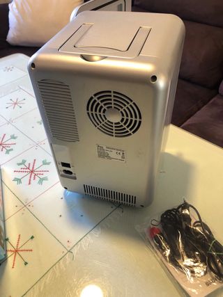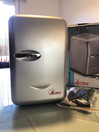 Mini frigorífico eléctrico de la marca Ardes, ideal para espacios pequeños. Su diseño es moderno y compacto. - Color plateado. - Asa cromada. - Incluye cables de conexión.