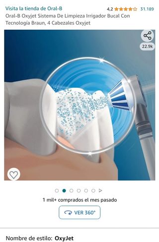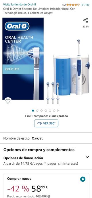 Oral-B Irrigador del centro de salud oral, 1 boquilla de oxyjet, 5 modos de limpieza y 4 chorros de agua, 1 boquilla de agua. Totalmente nuevo en su caja. Ver fotos reales del producto. Precio en Amazon 102,68. Tengo 2 unidades. - Tecnología Oxyjet. - Incluye 4 cabezales.