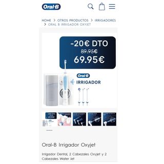 Oral-B, Sistema de Limpieza Irrigador Bucal con Tecnología Braun, 4 Cabezales, Blanco/Azul Irrigador Oxyjet de Oral-B Enriquece el agua con microburbujas de aire purificado para contribuir a la salud de las encías Limpia entre los dientes: elimina con suavidad los restos de comida Entregamos en mano en Hortaleza (Madrid), Aranjuez, Valdemoro y algunas zonas de Toledo, y en nuestro almacén en Cabaña de Yepes, Toledo, puede revisar el producto al recibirlo. TAMBIÉN HACEMOS ENVÍOS A TRAVÉS DE WALLAPOP SI LO PREFIERE. Aceptamos devoluciones hasta 30 días, como Amazon. 24 99