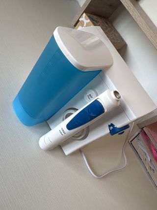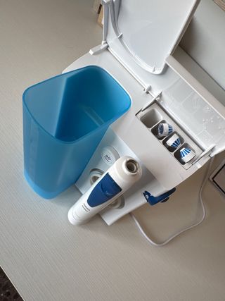 Irrigador dental Oral-B Braun OxyJet con muy poco uso. Incluye el depósito de agua y el mango con boquilla. - Depósito de agua azul. - Mango con botón de encendido/apagado. - Boquilla con cabezal de cepillo.