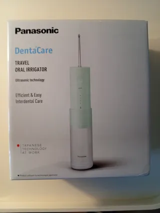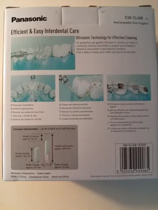 Irrigador oral de viaje Panasonic EW-DJ48.Nunca usado. - Tecnología ultrasónica para una limpieza eficaz. - Compacto y portátil, se pliega a la mitad. - Elimina restos de comida y limpia bolsas periodontales. - Ideal para limpiar alrededor de ortodoncia.