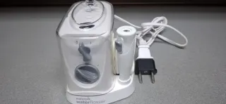 Irrigador Waterpik comprado en Estados Unidos. Este modelo es blanco y transparente, con un diseño compacto y moderno. Enchufe americano con adactador europeo. Maletin de viaje, sin caja para para pasar aduana - Incluye mango con botón, tres boquillas, sin uso. - Dial de control de presión. - Tapa transparente para el depósito.