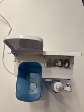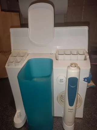 Cepillo de dientes eléctrico Oral B con irrigador. - FALTA mango de cepillo. - Depósito de agua azul. - Soporte para cabezales.