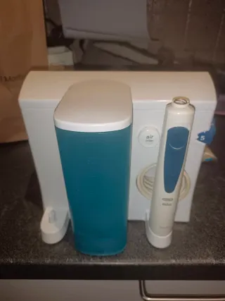 Cepillo eléctrico e irrigador bucal de la marca Braun Oral-B. Incluye el irrigador con su depósito de agua y un mango de cepillo. Mango de cepillo con botón de encendido. La goma está un poco pasada, pero funciona bien. Depósito de agua con medidor. Se recomienda, no echar Incluye 4 cabezales de recambio para el cepillo. (Sin usar)