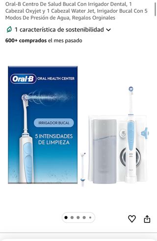 Centro de salud bucal Oral-B con irrigador dental. - Incluye 1 cabezal Oxyjet y 1 cabezal Water Jet. - Irrigador bucal con 5 intensidades de limpieza y presión de agua. - Opción Amazon. - 1 certificación de sostenibilidad. - Más de 600 comprados el mes pasado.