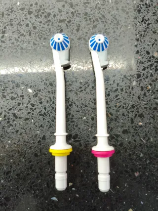 Dos recambios para irrigador bucal Oral B, sin estrenar. - Cabezales con diseño de rayas azules y blancas. - Mangos blancos con anillos de color (uno amarillo y otro rosa). - Empaquetados en plástico transparente.
