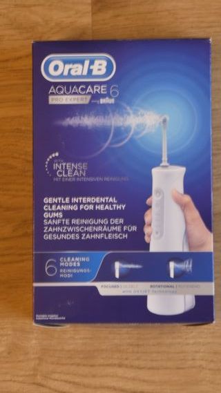 Nuevo, funciona perfectamente. Irrigador bucal portátil Oral-B Aquacare 4 con tecnología OxyJet. Diseñado para mejorar la salud de tus encías. Oral-B Aquacare, Irrigador Bucal Portátil con Tecnología Oxyjet 4 Modos de Limpieza, Blanco. - 4 modos de limpieza. - Modos: Focused (Geziellt) y Rotational (Rotierend). - Incluye tecnología OxyJet. F