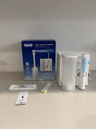 Irrigador bucal Oral-B Oral Health Center con tecnología OxyJet. - Enriquecido con Micro Burbujas para mejorar la salud de las encías. - Incluye unidad principal, vaso, cepillo y boquillas. -Sin uso .