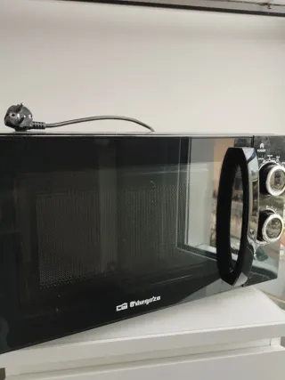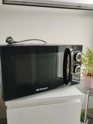 Microondas Orbegozo en color negro, ideal para piezas o reparación. - Diseño moderno y elegante. - Puerta con cristal. - Asa integrada para apertura.