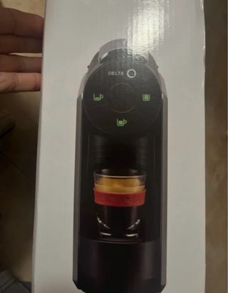 Máquina de café Delta con un diseño moderno y compacto. - Color negro. - Incluye vaso con banda protectora.