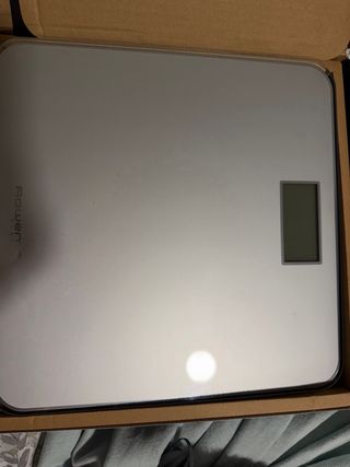 Báscula electrónica SALTER de color crema. - Diseño moderno con líneas verticales. - Pantalla digital para fácil lectura. - Marca SALTER visible. - 2 posición por kg/Lb CODIGO:00.622091