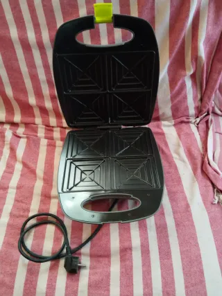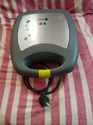 Sandwichera Fagor en color gris con detalles decorativos. - Indicadores luminosos de encendido y listo. - Asa de transporte integrada. - Cable de alimentación con enchufe europeo.