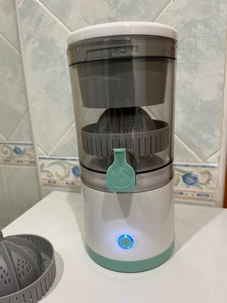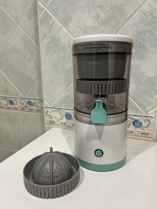 Exprimidor de zumos en buen estado. Ideal para preparar zumos frescos. - Diseño elegante y moderno. - Fácil de usar y limpiar. - Incluye recipiente para zumo. Info: Se ha usado solamente para testear su funcionamiento
