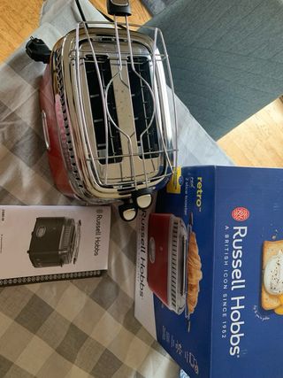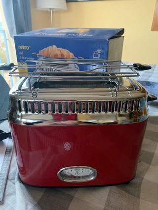 Tostadora Russell Hobbs de estilo retro en color rojo. Cuenta con un diseño elegante y funcional. - Acabado cromado brillante. - Ranuras para 2 rebanadas. - Selector de nivel de tostado. - Función de descongelar