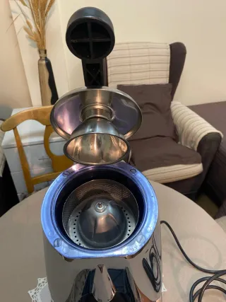 Exprimidor de frutas con un diseño moderno y acabado brillante. Ideal para preparar zumos frescos en casa. - Cuerpo metálico pulido. - Aro superior de color azul. - Cesta interior perforada.