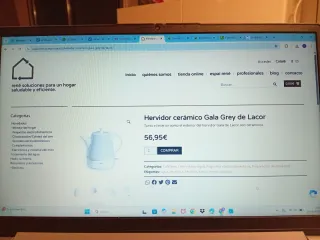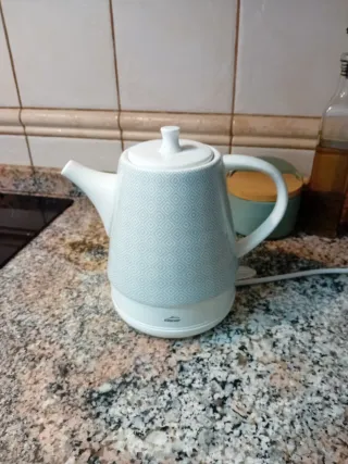 Hervidor eléctrico de agua de la marca Lacor. Tanto el interior como el exterior son ceramicos. Su diseño combina blanco con un patrón geométrico elegante y atemporal. Tengo uno y estoy encantada con él, es súper practico. Pero dispongo de otro nuevo, que regalé a un familiar que no toma regularmente infusiones y esta en su caja por estrenar.