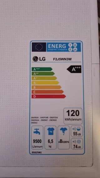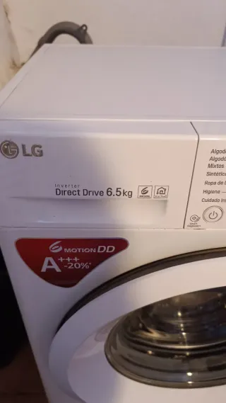 Lavadora LG con tecnología Direct Drive y capacidad de 6.5 kg. 4 años y medio, buen estado. - Clase energética A+++ - Consumo de agua: 9500 L/annum - Nivel de ruido (lavado): 55 dB - Nivel de ruido (centrifugado): 74 dB - Consumo energético: 120 kWh/annum