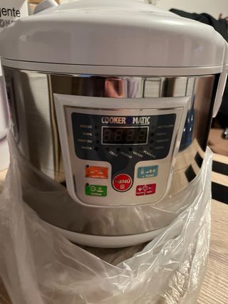 Robot de cocina inteligente CookerMatic con capacidad de 5 litros. Ideal para preparar una gran variedad de platos. - Capacidad: 5L. - Programable 24 horas. - 12 sistemas de seguridad. - Incluye manual de instrucciones.