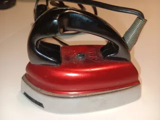 Plancha de viaje antigua con un diseño retro y llamativo color rojo. - Cuerpo principal en acabado rojo brillante. - Asa negra. - Base metálica. - Cable de alimentación con muelle protector.