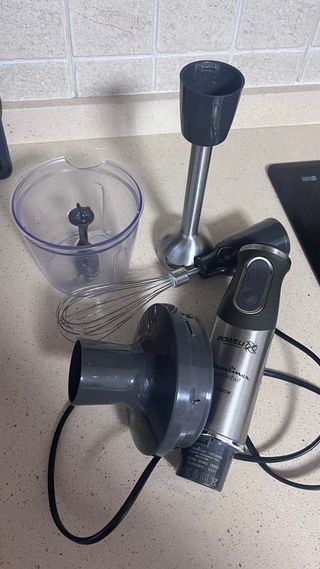 Batidora de mano Moulinex Quickchef con motor de 1000W. - Incluye varillas para montar. - Diseño plateado y negro. - Cable de alimentación.
