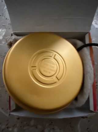 Termo calentador de color dorado, con un diseño circular. - Modelo: VOD-1000 - Voltaje: 220V-/50-60Hz - Potencia: 850 W