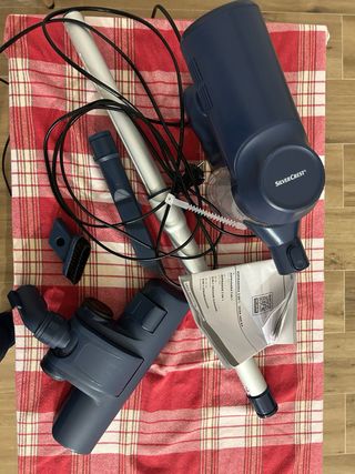Aspiradora Silvercrest modelo Basic 2 en 1, versátil para usar como aspirador de mano o de suelo. Potencia de 600W. - Diseño en color azul marino. - Incluye accesorios para diferentes usos. - Eficiencia de filtración del 99,5%.