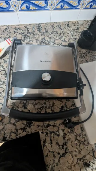 Vendo Grill eléctrico SilverCrest en buen estado. La vendo por falta de espacio. Es ideal para cocinar de forma saludable (carnes, pescados, verduras) o para hacer los mejores sándwiches tipo panini y tostadas crujientes. Potencia: Calentamiento rápido y uniforme. Diseño: Acabado en acero inoxidable de alta calidad, muy resistente. Placas: Antiadherentes (se limpian con pasar un papel de cocina o un paño húmedo). Seguridad: Incluye luces indicadoras de funcionamiento (roja) y de temperatura alcanzada (verde). Bandeja recogegrasas: Incluida, para una cocina más limpia y sana.