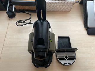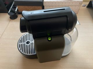 Cafetera Nespresso DeLonghi en color negro y transparente. - Depósito de agua transparente. - Bandeja recogegotas. - Indicador luminoso. Poco uso. Filtro, bandejas, depósito, conector con cafetera, base, cable... todo en buen estado. Es el modelo de estilo retro, creo que fue el primer diseño que sacaron a la venta. Ya no se fabrica, aunque hay piezas de recambios aun en Amazon, etc. Si la cuidas bien, no tendrás problemas.