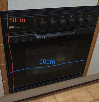 Horno eléctrico Teka HE-490 ME de 60cm de ancho. - Color negro. - Panel de control con mandos. - Puerta con cristal. - mecanismo giratorio interior - se entrega sucio
