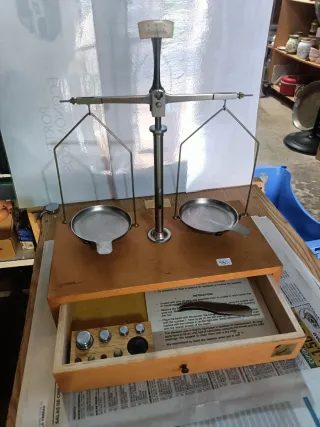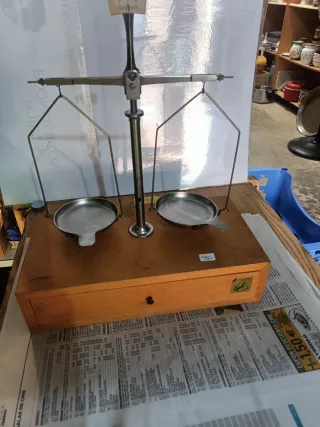 Báscula de precisión de la marca Kiesel, ideal para mediciones exactas. - Construcción robusta en madera y metal, señales de paso tiempo sin desperfectos en la madera. - cajón de pesas, le falta una. - Dos platillos para pesaje. - Cajón integrado para almacenamiento.