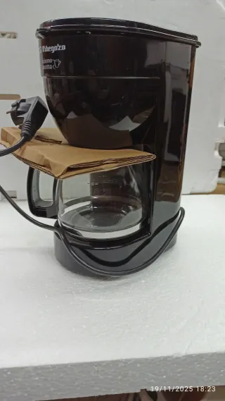Cafetera de goteo Orbegozo en color negro. Diseñada para preparar café de forma sencilla y rápida. - Capacidad para 6 tazas. - Jarra de cristal. - Indicador de nivel de agua. Funciona correctamente, lo único que le ocurre es que se la tapa de queda un poco abierta y hay que apretarla mientras se hace el café, o ponerle algo de peso encima, como se aprecia en las fotos.
