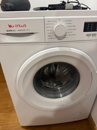 Lavadora de carga frontal Onwa, modelo LD 6111. - Capacidad de 6 kg. - Velocidad de centrifugado de 1.000 RPM. - Clasificación energética A++. Tiene la goma mordida ( no se sale el agua ) y hay que hacer un empalme en el tubo desague !! no le cambio porque aproveche a comprarme otra de mas kilos ya que somos 4 en casa ! 80 negociables!!