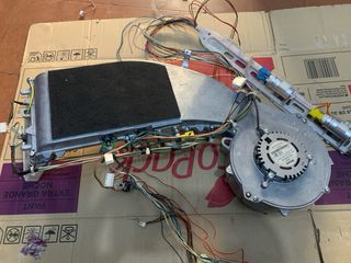 Componentes de ventilador y módulo de control para lavadora o secadora Bosh. - Ventilador metálico con motor. - Módulo de control con cableado.