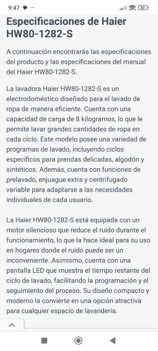 Producto Nuevo de tara estetica inapreciable Garantia Oficial 3 Años Lavadora carga superior Haier 8 kg / 1.200 rpm - THASN286TM5-S Soluciones tecnológicas avanzadas para un lavado perfecto La lavadora de carga superior Haier THASN286TM5-S de la Serie 7 ofrece una capacidad de 8 kilos y una velocidad de centrifugado de 1200 rpm. Este modelo combina diseño compacto con tecnología avanzada, garantizando un cuidado profesional para todo tipo de prendas. Motor Inverter de alta eficiencia Equipado con un motor Inverter, este modelo asegura un rendimiento superior con menor consumo energético y una clasificación energética Clase A. Gracias a su durabilidad y tecnología silenciosa, disfrutarás de ciclos de lavado más eficientes y económicos. Conectividad inteligente hOn La aplicación hOn permite el control remoto de la lavadora mediante Wi-Fi y Bluetooth. Accede a más de 60 programas especializados, monitorea el estado del lavado y recibe sugerencias personalizadas, mejorando así la experiencia de uso y optimizando los resultados de lavado. Programas de vapor para máxima higiene Incorpora tecnología de higienización a vapor que elimina bacterias y alérgenos, protegiendo los tejidos más delicados y manteniendo las prendas frescas. Ideal para el cuidado de ropa de bebé, lana y tejidos sensibles. Apertura Gentle Touch y diseño ergonómico Con un mecanismo innovador, la apertura Gentle Touch permite un acceso fácil y seguro al tambor. Además, su diseño compacto y elegante es ideal para espacios reducidos, sin comprometer la funcionalidad ni la capacidad. Funciones y programas versátiles Entre sus funciones destacan el inicio diferido hasta 24 horas, programas rápidos de 14 y 44 minutos, y ajustes para temperatura y centrifugado, adaptándose a todas tus necesidades de lavado."