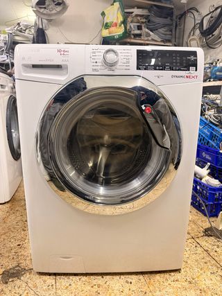Lavadora secadora de la marca Hoover con capacidad de 10 kg de lavado y 6 kg de secado. - Color blanco. - Panel de control digital. - Puerta frontal con acabado cromado. Tiene una pequeña grieta en la puerta pero funciona perfectamente.